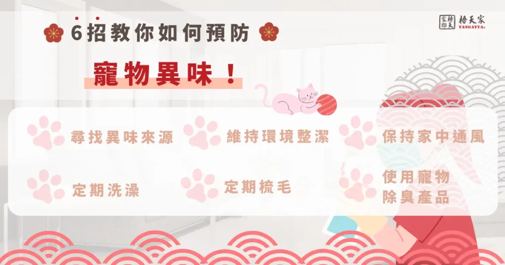 平時除了可以透過噴除臭噴霧外,保持以下 6 種方式也可以預防異味:尋找異味來源、定期洗澡、維持環境整潔及定期梳毛。