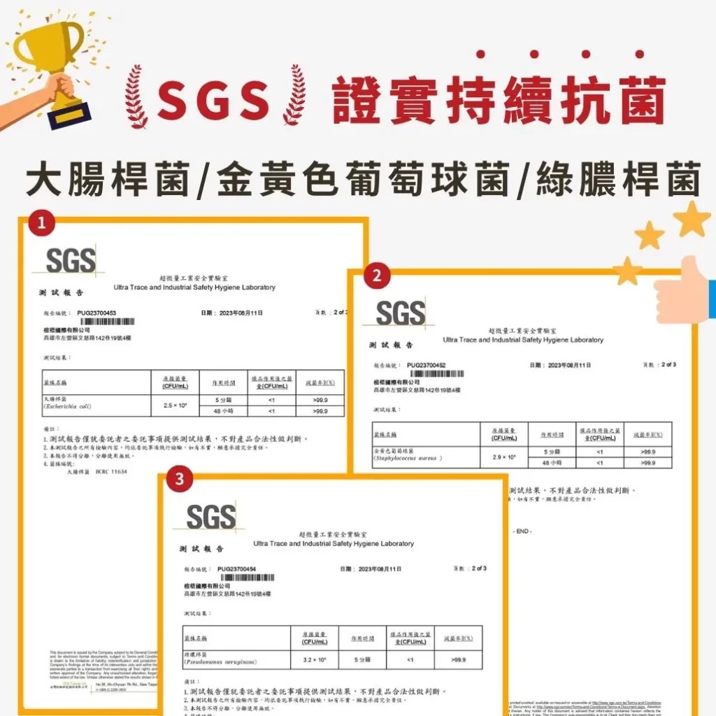 •       SGS 48 小時抗菌認證