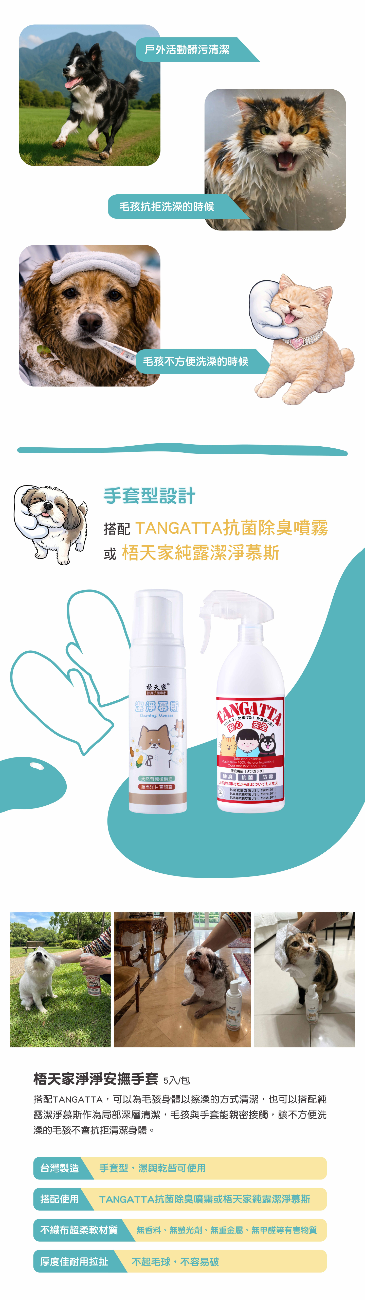 直接噴灑TANG A T T A抗菌噴霧或純露潔淨慕斯在手套上,輕鬆擦拭毛孩全身不需要沖水。